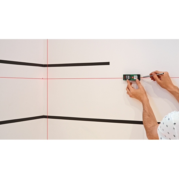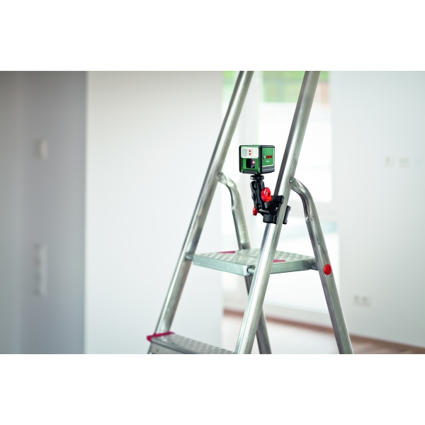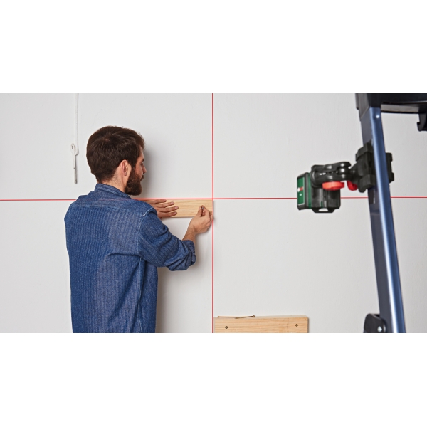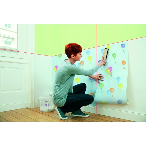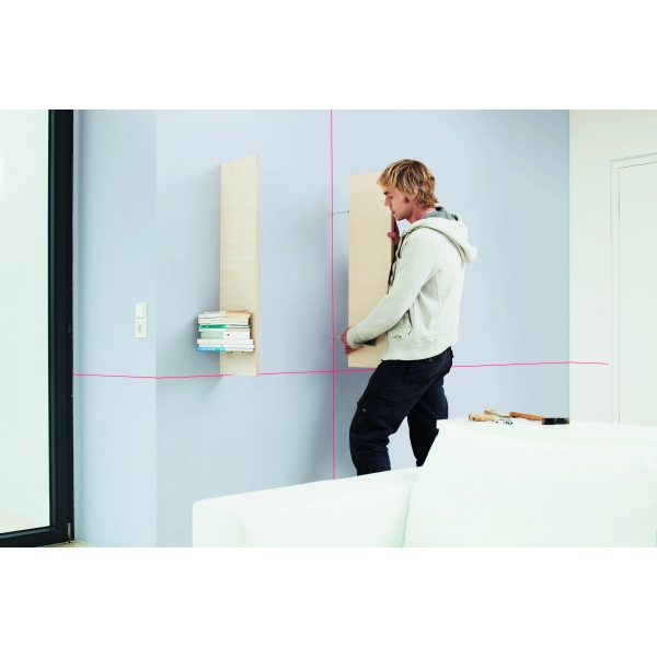 Cu clapeta de acoperire deschisa, aparatul este imediat pregatit de functionare si proiecteaza gratie autonivelarii o cruce laser dreapta 100% pe perete.