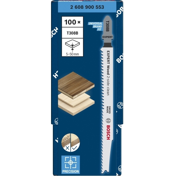 Bosch - EXPERT Wood 2-side clean T 308 B - Set panze fierastrau pendular, tija cu un prag de prindere (T), 117 mm, lemn, taiere dreapta, fina, 100 bucati