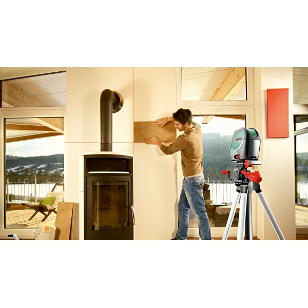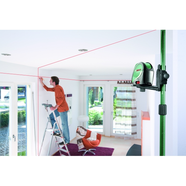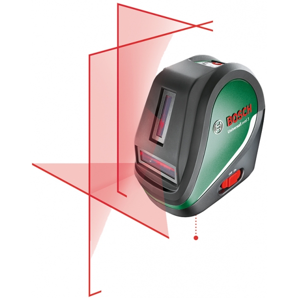 Proiectarea unei linii laser in cruce cu linie verticala suplimentara intr-un unghi de 90 grade si punct de verticala inferior.