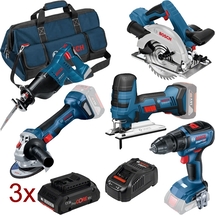 Cod articolPachet - Bosch - Masina de gaurit si insurubat + Polizor unghiular + Fierastrau circular + Fierastrau pendular + Fierastrau sabie + 2 acumulatori, 18 V, 4 Ah + Incarcator + Geanta textila