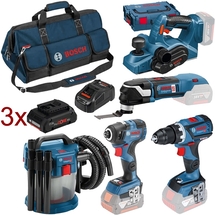 Cod articolPachet - Bosch - Masina de gaurit si insurubat + Masina de insurubat cu impact + Rindea + Multicutter + Aspirator + 3 acumulatori, 18 V, 4 Ah + Incarcator + Geanta textila