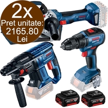 Set de livrare2 x Bosch - GBH 180-LI + GSR 18V-50 + GWS 180-LI + 1600A00B8J + 1619BZ0100 - Rotopercutor SDS-Plus, 2 J + Masina de gaurit si insurubat, 50 Nm + Polizor unghiular, 125 mm + Set 2 acumulatori si incarcator, Li-Ion, 18 V, 5 Ah + Geanta textila pentru scule, 480x280x300 mm
