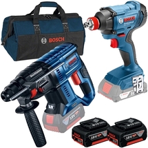 DenumireBosch - GBH 180-LI + GDX 180-LI + 2x 1600Z00038 + GAL 18V-40 + 1619BZ0100 - Rotopercutor SDS-Plus, 2 J + Masina de insurubat cu impact, 180 Nm, M6-M14 + 2x Acumulator, Li-Ion, 18 V, 4 Ah + Incarcator, incarcare rapida + Geanta textila, 480x280x300 mm