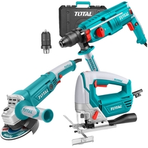 Cod articolPachet - Total - TH308268-2 + TG1121256-3 + TS2081006 - Rotopercutor SDS-Plus, 800 W, 2.5 J, mandrina interschimbabila, valiza plastic, accesorii + Polizor unghiular, 1010 W, 125 mm + Fierastrau pendular, 800 W