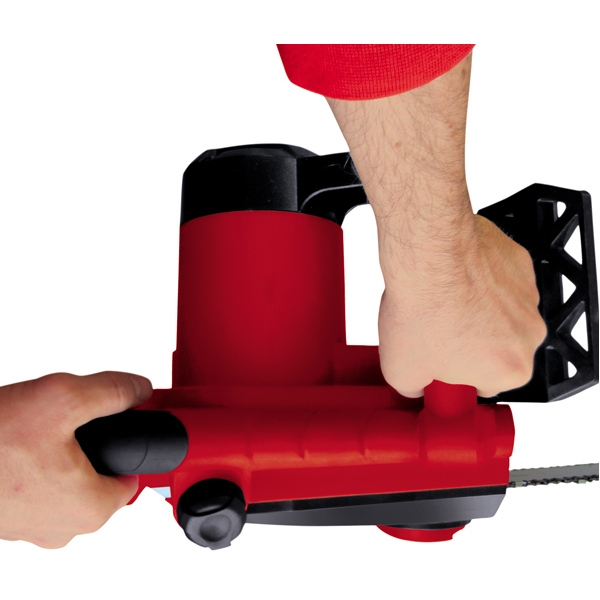Un opritor cu gheara robust din metal contribuie la o manevrare sigura si serveste, de asemenea, ca punct de pivotare atunci cand se taie trunchiuri orizontale. O clema de eliberare a tensiunii protejeaza cablul de alimentare.