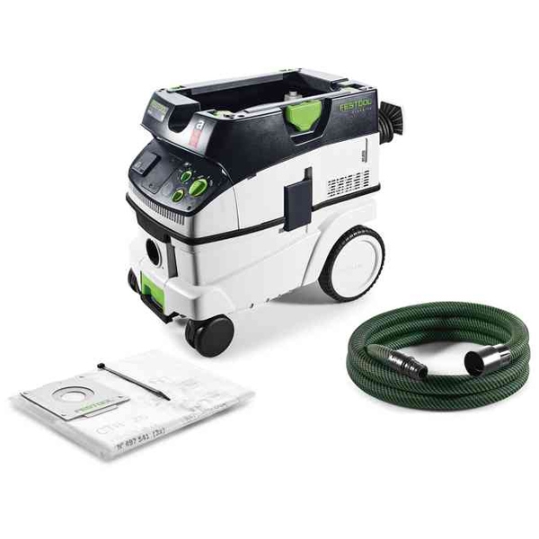Totul in perfecta ordine: cablul de retea si furtunul de aspirare sunt depozitate ordonat si bine protejate in suportul pentru furtun Festool integrat ferm si infasuratorul de cablu.