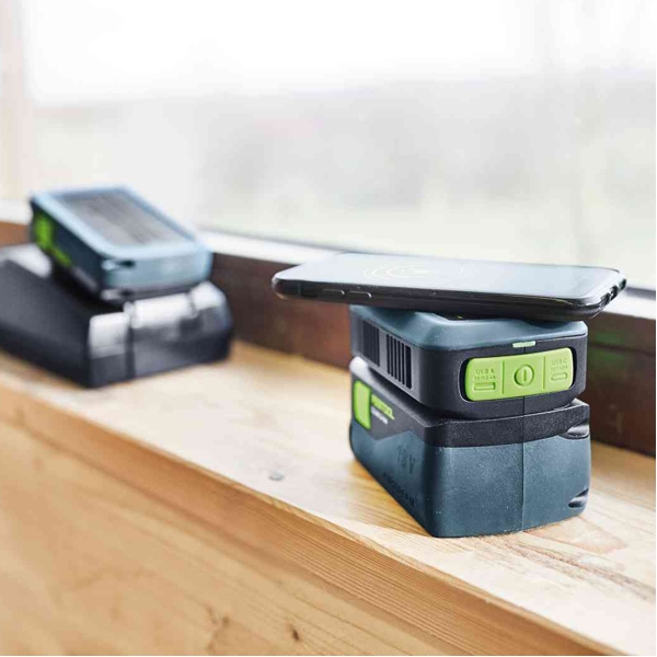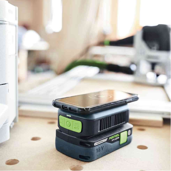 Indiferent de ce acumulatorii 18 V Festool utilizati, incarcatorul mobil PHC 18 ii transforma pe toti in baterii externe (exceptand: acumulatorul Ergo 3,0/3,1 Ah). Impingeti smartphone-ul ca o scula cu acumulator pe acumulatorul incarcat, si va fi imediat alimentat cu energie electrica.