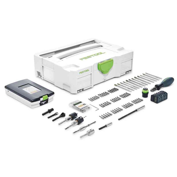 Pe langa diversi biti de surubelnite si de burghie sunt incluse o mandrina CENTROTEC cu centrare a bitilor, zencuitor cu limitator de reglare a adancimii si multe alte accesorii.
