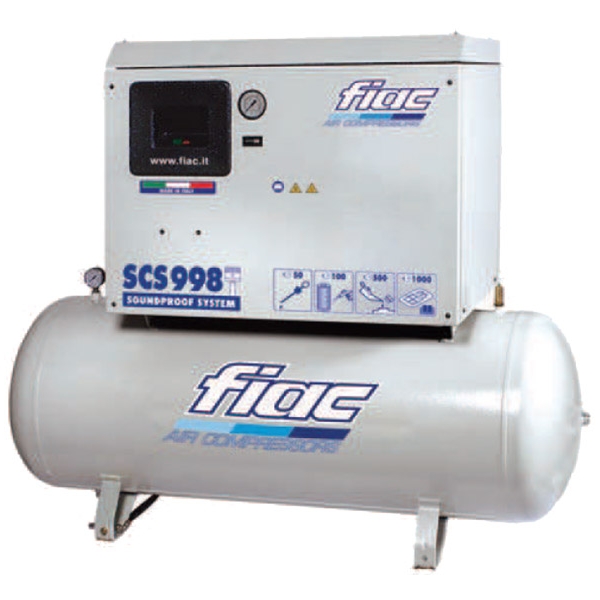 Compresoarele din seria SCS sunt compresoare silentioase, care au montate in carcasa fono-absorbanta o pompa cu antrenare cu curea cu doi cilindrii si motorul electric trifazat. Grupul compresor are o constructie robusta, aripioare de racire a cilindrului si a capacului chiulasei, ventilatie fortata cu debit mare.