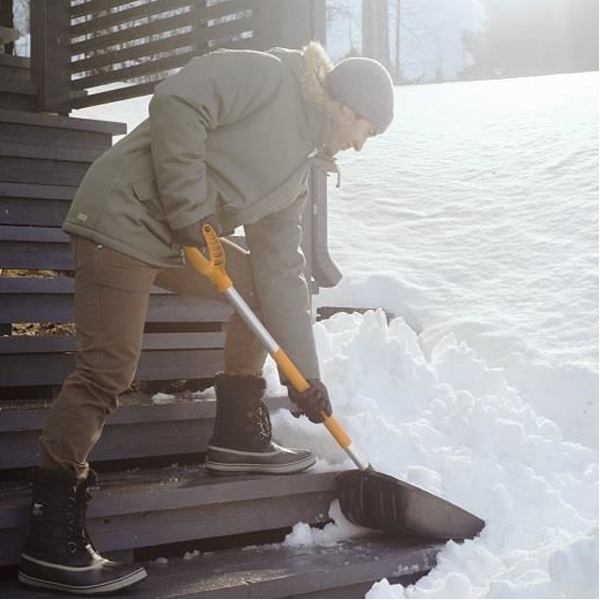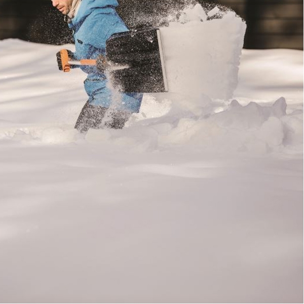 Prevazuta cu maner ergonomic de culoare portocalie - usor de gasit in zapada.