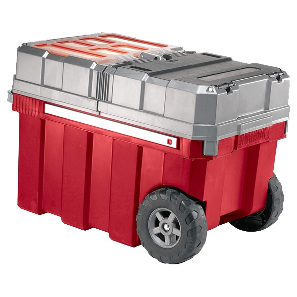 Geanta are 2 roti rezistente, capabile sa faca fata la orice mediu, un maner tip troller, un spatiu mare de depozitare pentru scule si unelte, iar pe capac se gaseste si un organizator.