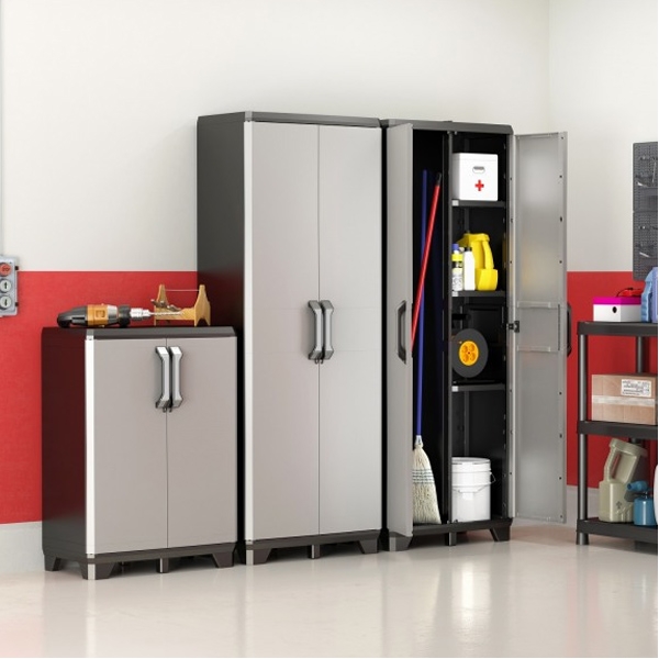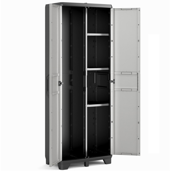 Este impartit in 2 compartimente, partea din stanga se poate folosi pentru depozitarea uneltelor lungi, in timp ce partea din dreapta se poate personaliza cu ajutorul celor 3 rafturi ajustabile care suporta o greutate de 10 Kg fiecare.