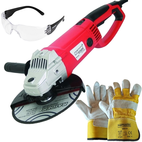 Pachet Raider - RD-AG38 + Topmaster - 561403 + TMP-PG02 - Polizor unghiular, 2350 W, 230 mm + Ochelari de protectie, lentile incolore + Manusi, marime 10, piele de vitel si material textil