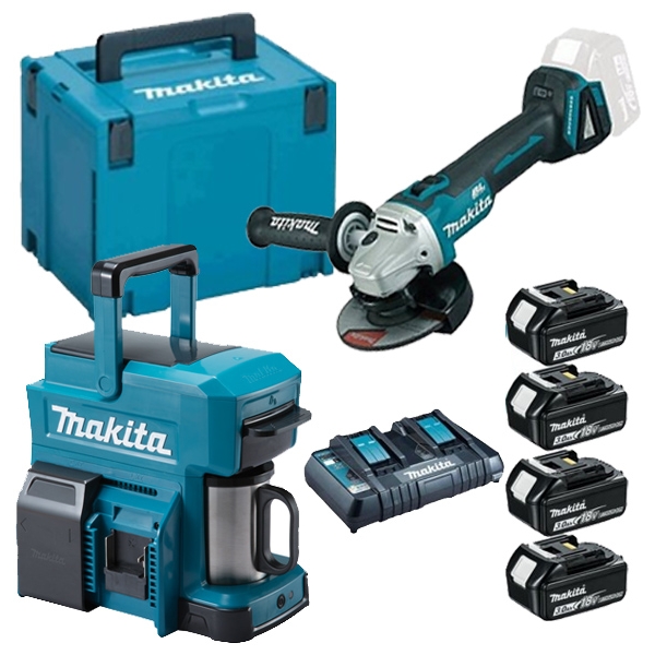 Pachet Makita - DCM501Z + DGA504Z - Aparat de facut cafea + Polizor unghiular, 125 mm, 4 acumulatori, Li-Ion, 18 V, 3 Ah