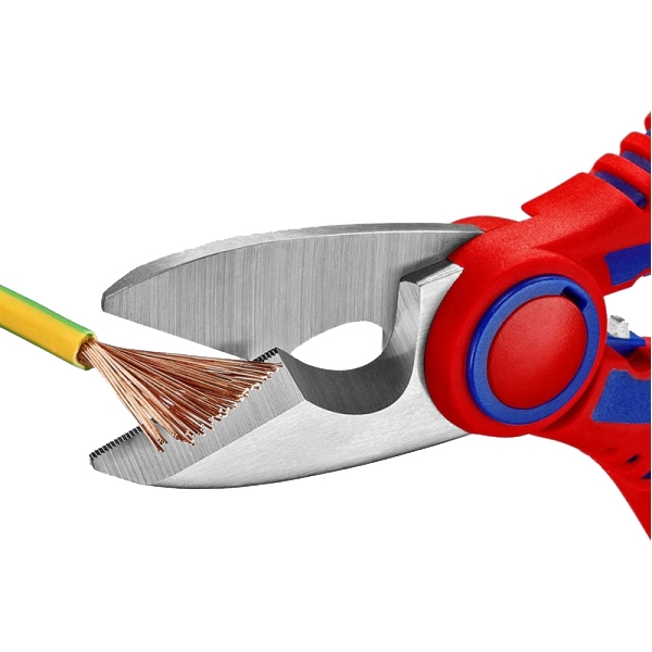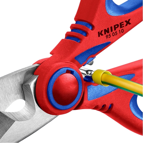 Foarfece electrician KNIPEX 95 05 10 SB. Este un instrument indispensabil pentru orice electrician si este destinat taierii si desprinderii diferitelor cabluri electrice din cupru. Specialistii KNIPEX au fost in masura sa furnizeze acest instrument simplu cu functionalitati suplimentare. Multi electricieni ar trebui sa il aiba in necesarul de scule.