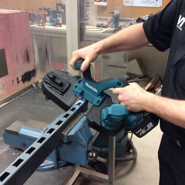 Fierastraul cu banda profesional DPB181Z de la MAKITA poate fi alimentat cu acumulatori litiu-ion 18 V, avand o capacitate de taiere de 64 mm in piese rotunde si rectangulare.