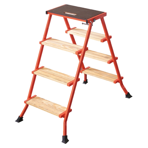 Scara dubla pliabila LESCABO din otel, 2 tronsoane cu trepte din lemn: