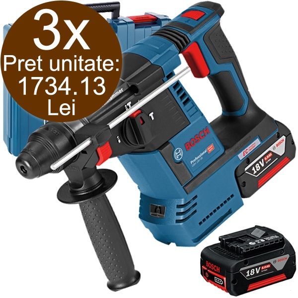 3 x Bosch - GBH 18V-26 - Rotopercutor SDS-Plus cu 2 acumulatori, Li-Ion, 18 V, 6 Ah, 2.6 J, motor fara perii, sistem antivibratii, turatie constanta, led iluminare, turatie reglabila, valiza plastic: