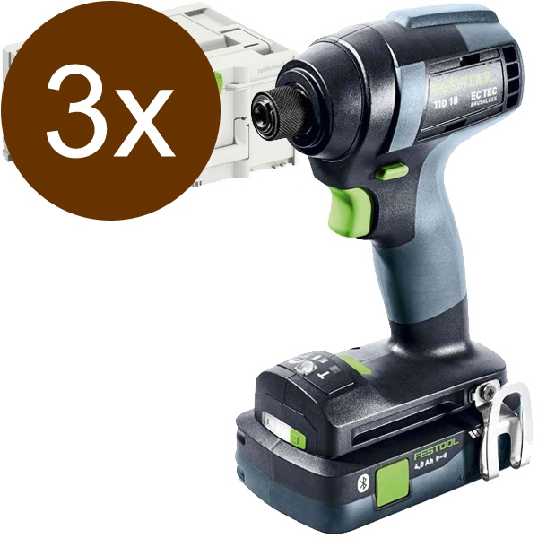 3 x Festool - TID 18-Basic + BP 18 Li 4.0 HPC-ASI - Masina de insurubat cu impact cu 1 acumulator, Li-Ion, 18 V, 4 Ah, 180 Nm, M8, motor fara perii, turatie reglabila, led iluminare, valiza speciala: