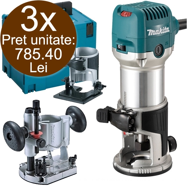 3 x Makita - RT0702CX2J - Masina de frezat, 710 W, 6, 8 mm, functie antirestart, ghidaj fin, turatie constanta, pornire lina, reglaj fin, turatie reglabila, valiza speciala, accesorii: