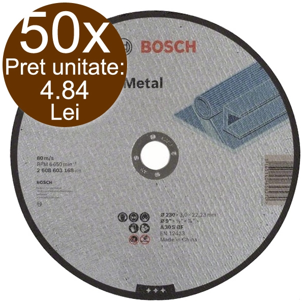 Disc abraziv Standard Bosch 2608603168 pentru debitat metal, cu degajare D 230x22.23x3 mm taie in mod fiabil prin metal.