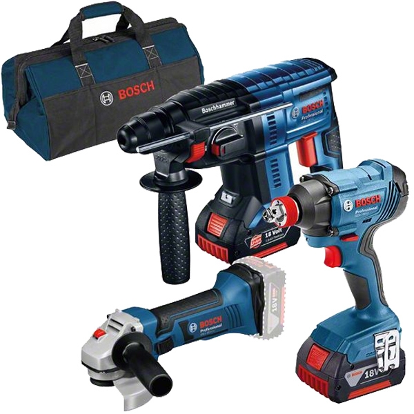| Set de livrare | 1 x Bosch - GBH 180-LI - Rotopercutor SDS-Plus 1 x Bosch - GDX 180-LI - Masina de insurubat cu impact Bosch - GWS 18-125 V-LI - Polizor unghiular, 125 mm 2 acumulatori, Li-Ion, 18 V, 6 Ah Incarcator rapid GAL 1880 CV Geanta textila |