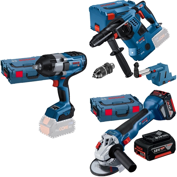 | Set de livrare | 1 x Bosch - GBH 18V-28 CF - Rotopercutor SDS-Plus fara acumulatori si incarcator, Li-Ion, 18 V, - Ah, 3.3 J, mandrina interschimbabila, valiza speciala, accesorii Laveta de curatare Limitator de adancime Mandrina cu schimbare rapida SDS-Plus Maner suplimentar Tub de vaselina Insertie L-BOXX Valiza de transport si depozitare L-BOXX 238 Sistem de aspirare GDE 18V-16 1 x Bosch - GDS 18V-1000 - Masina de insurubat cu impact fara acumulatori si incarcator, Li-Ion, 18 V, - Ah, patrat 1/2 inch, 1000 Nm, M14-M24, valiza speciala Clema de fixare pe scara 1/1 insertie L-BOXX pentru scula si incarcator Valiza de transport si depozitare L-BOXX 136 1 x Bosch - GWS 18V-10 - Polizor unghiular cu 2 acumulatori, Li-Ion, 18 V, 5 Ah, 125 mm, valiza speciala 2 acumulatori, Li-Ion, 18 V, 5 Ah Incarcator rapid GAL 1880 CV Flansa de prindere Piulita cu fixare rapida Aparatoare de protectie 1/1 insertie L-Boxx pentru scula si incarcartor Valiza de transport si depozitare L-Boxx 136 |