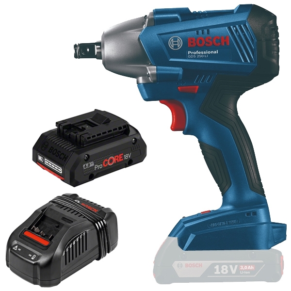 | Set de livrare | 1 x Bosch - GDS 250-LI - Masina de insurubat cu impact fara acumulatori si incarcator, Li-Ion, 18 V, - Ah, 250 Nm, M10-M18, led iluminare 1 x Bosch - ProCORE - Acumulator, Li-Ion, 18 V, 4 Ah, indicator nivel incarcare 1 x Bosch - GAL 1880 CV - Incarcator acumulatori Li-Ion, 14.4-18 V, incarcare rapida |