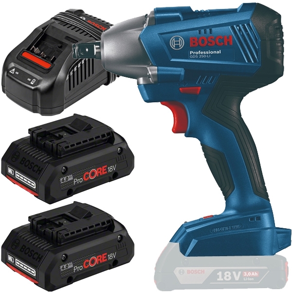| Set de livrare | 1 x Bosch - GDS 250-LI - Masina de insurubat cu impact fara acumulatori si incarcator, Li-Ion, 18 V, - Ah, 250 Nm, M10-M18, led iluminare 2 x Bosch - ProCORE - Acumulator, Li-Ion, 18 V, 4 Ah, indicator nivel incarcare 1 x Bosch - GAL 1880 CV - Incarcator acumulatori Li-Ion, 14.4-18 V, incarcare rapida |