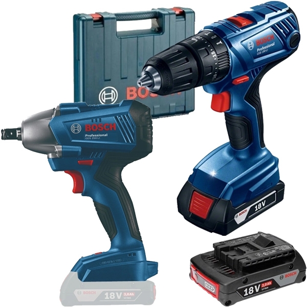 | Set de livrare | 1 x Bosch - GDS 250-LI - Masina de insurubat cu impact fara acumulatori si incarcator, Li-Ion, 18 V, - Ah, 250 Nm, M10-M18, led iluminare Cutie de carton 1 x Bosch - GSB 180-LI - Masina de gaurit si insurubat cu percutie cu 2 acumulatori, Li-Ion, 18 V, 2 Ah, 54 Nm, led iluminare, valiza plastic 2 acumulatori, Li-Ion, 18 V, 2 Ah Incarcator GAL 18V-20 Valiza de transport si depozitare |