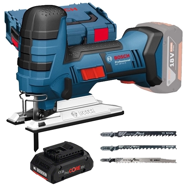 | Set de livrare | 1 x Bosch - GST 18V-LI S - Fierastrau pendular fara acumulatori si incarcator, Li-Ion, 18 V, - Ah, prindere rapida accesorii, turatie reglabila, functie pendulare, valiza speciala 1 x panza de fierastrau vertical T 144 DP, Precision for Wood 1 x panza de fierastrau vertical T 244 D, Speed for Wood 1 x panza de fierastrau vertical T 308 BP, Precision for Wood 1/1 insertie L-BOXX pentru scula si incarcator Protectie impotriva ruperii aschiilor Valiza de transport si depozitare L-BOXX 136 1 x Bosch - ProCORE - Acumulator, Li-Ion, 18 V, 4 Ah, indicator nivel incarcare |