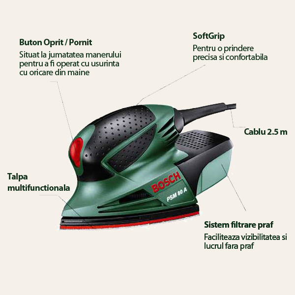 Bosch PSM 80 A este exemplul perfect pentru cat de compact si comod poate fi un slefuitor multifunctional. Produsul poate fi utilizat pentru a indeparta vopseaua de pe lemn, pentru restaurarea mobilei vechi si chiar pentru a finisa suprafete vopsite. Cu o constructia ergonomica si cu o putere de 80 de Watt, chiar si cele mai mari proiecte par floare la ureche.