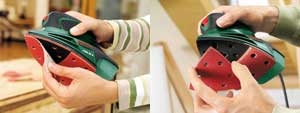 PSM 80 A combina functiile unui slefuitor orbital cu cele ale unui slefuitor Delta. Suprafata de slefuire (talpa) seamana cu un fier de calcat si este alcatuita din 2 parti. Partea din spate este fixa, iar cea din fata, in forma delta, este mobila. De exemplu, daca varful talpii de vine uzat, placa in forma delta se poate roti cu totul sau foaia abraziva se poate desface si apoi prinde la loc in alta pozitie (foarte rapid, prin sistemul Velcro). Astfel foaia abraziva din fata se poate toci in mod egal in toate cele 3 colturi, prelungind durata de viata.