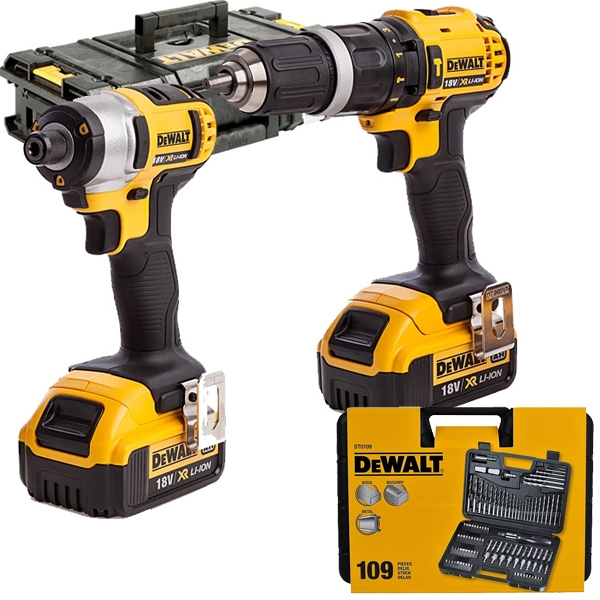 | Set de livrare | 1 x DeWalt - DCD785N + DCF885 - Masina de gaurit si insurubat cu percutie, 60 Nm + Masina de insurubat cu impact, 115 Nm, 2 acumulatori, Li-Ion, 18 V, 4 Ah, valiza plastic 1 x DeWalt - DT0109 - Set accesorii insurubare si burghie mixte, 109 bucati |