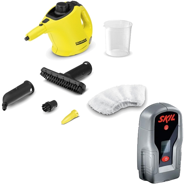 | Set de livrare | 1 x Karcher - SC 1 - Curatitor cu aburi, 1200 W, 3 bar, 3 minute Duza de mana Duza de finisare Duza de putere Perie rotunda (mica) Cupa de masurare Husa de microfibra pentru duza de mana 1 x Skil - 0551 AB - Detector de metale cu baterii alcaline, 30 mm 1 x acumulator de 9 V, 6LR61 |