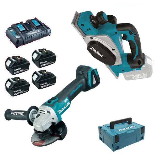 | Set de livrare | 1 x Makita - DKP180Z - Rindea de mana, 82 mm 1 x Makita - DGA504Z - Polizor unghiular, 125 mm Maner lateral Aparatoare disc Cheie de strangere Disc pentru degrosare 125 mm 4 acumulatori, Li-Ion, 18 V, 3 Ah Incarcator rapid DC18RD Valiza de transport Makpac |