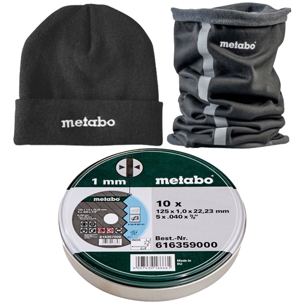 | Set de livrare | 1 x Metabo - 657036000 - Caciula si fular 1 x Metabo - 616359000 - 10 x disc taiere inox, 125x22.2x1 mm |