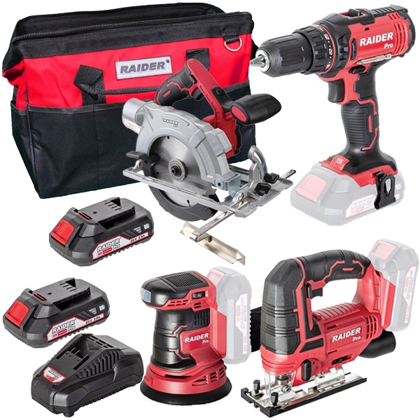 | Set de livrare | Raider - RDP-SCD20 - Masina de gaurit si insurubat Raider - RDP-SJS20 - Fierastrau pendular Raider - RDP-SCSI20 - Fierastrau circular Raider - RDP-SRSA20 - Slefuitor cu excentric Set 1 acumulator, Li-Ion, 20 V, 2 Ah si incarcator Acumulator, Li-Ion, 20 V, 2 Ah Raider - 499940 - Geanta textila |
