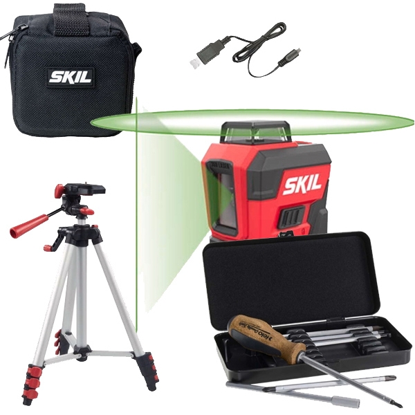 Set de livrare 1 x Skil - 1961 DA - Nivela laser cu linii, 30 m, +/-0.5 mm/m, 2 linii laser, fascicul verde, proiectie 360 grade, trepied, geanta textila