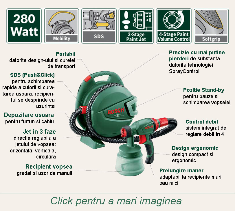 Sistemul de pulverizare fina Bosch PFS 65 simplifica vopsitul si alte proiecte de acest gen. Il puteti folosi sa pulverizati cu precizie vopsea, email, lac, ulei si multe alte substante. Sistemul de pulverizare PFS 65 poate fi folosit rapid si usor atat pe suprafete din interior cat si pe cele din exterior; chiar si cei cu putina experienta pot avea rezultate profesionale.