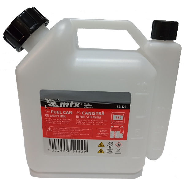 Bidon plastic MTX pentru amestec ulei si benzina (1.5 L) folosit la motocose si drujbe.
