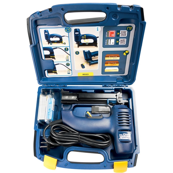 | Set de livrare | Capse Rapid Nr. 53, lungime 20mm - 540 buc Cuie Rapid Nr. 8, lungime 20mm - 750 buc Valiza de transport si depozitare |
