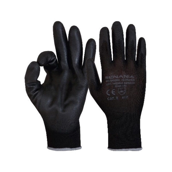 Manusa tricotata din poliester, de culoare neagra, cu strat subtire de poliuretan in palma si pe degete, manseta elastica.