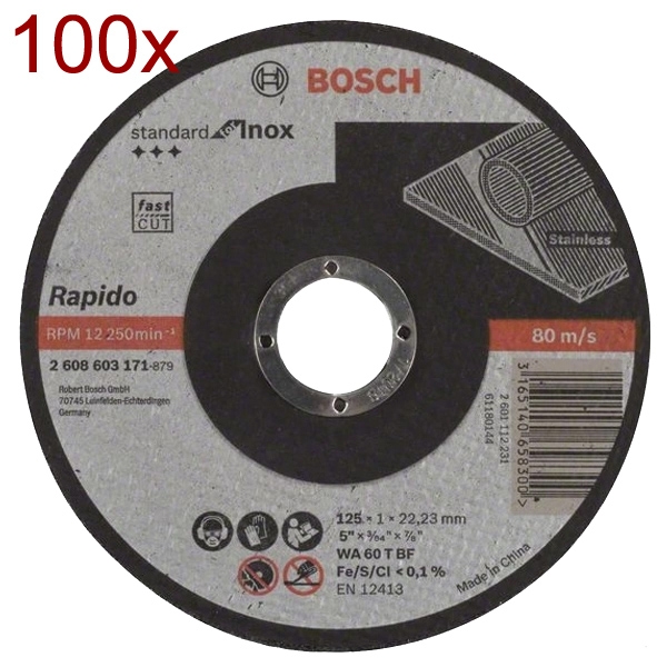 Pachet 100x Bosch - Standard for Inox - Rapido - Disc taiere inox, 125x22.2x1 mm