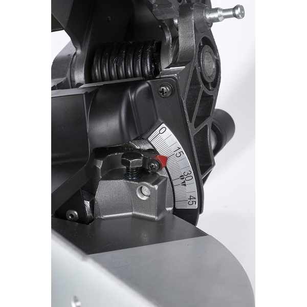Capul rabatabil al fierastraului si posibilitatea de rotire a platoului pot realiza o taiere la unghi de precizie