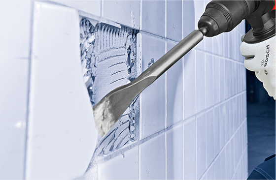 Îndepărtarea plăcilor de ceramică cu dalta plată SDS-plusFuncția Vario-Lock ajută utilizatorul să poziționeze în mod optim tăișul dălții în vederea unor operațiuni controlate |