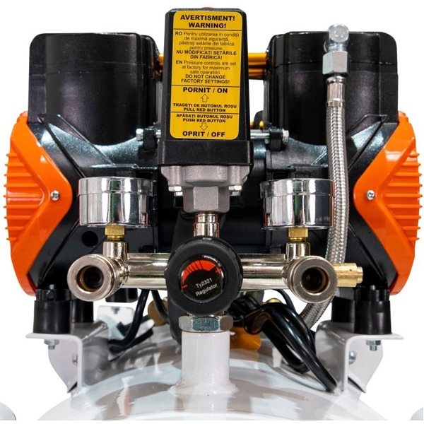 2 cilindri asigura o comprimare rapida si uniforma, garantand debit constant si presiune stabila. Astfel, timpul de asteptare pentru reumplerea rezervorului este redus, permitand utilizarea continua a sculelor pneumatice, chiar si in conditii solicitante.