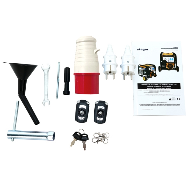 | Set de livrare | Acumulator 12 V Set roti Port chei cu cheie bujie, surubelnita, cheie 10-12 2 x stechere monofazate 16 A Stecher trifazat 32 A Palnie pentru ulei 2 x telecomanda radio 2 x cheie pornire Conector comanda externa pentru ATS, invertor OffGrid Manual de utilizare |