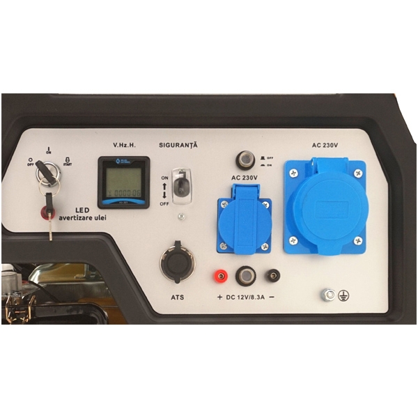 | Informatii suplimentare | Tip ulei: SAE10W-30, 15W-40 2 prize monofazate 16 A si 32 A, grad protectie IP44 Afisaj digital pentru frecventa, tensiune si numar ore functionare Led avertizare ulei Siguranta termica Iesire curent continu 12V/8A Sistem pornire la sfoara si electric cu cheie ON/OFF/START |