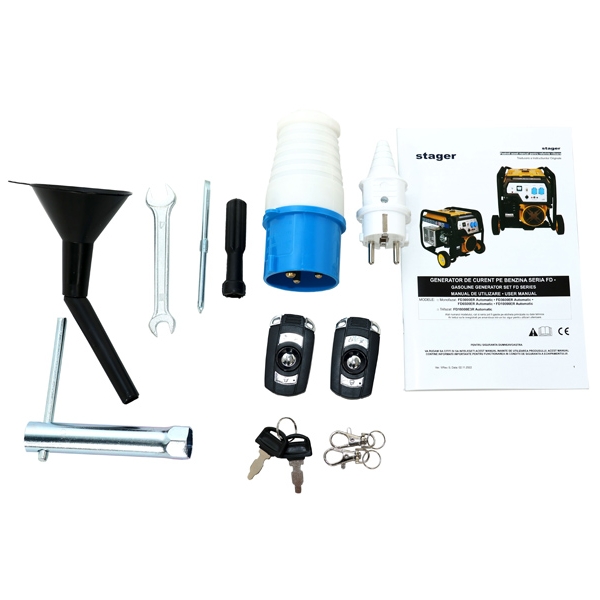 | Set de livrare | Acumulator 12 V Set roti Port chei cu cheie bujie, surubelnita, cheie 10-12 2 x stechere monofazate 16 A si 32 A Palnie pentru ulei 2 x telecomanda radio 2 x cheie pornire Conector comanda externa pentru ATS, invertor OffGrid Manual de utilizare |